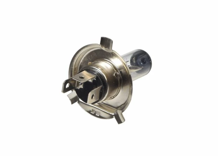 The 12 volt 35/35W (35 watt) H4 headlight bulb is permanently attached to its flanged P43T style metal base